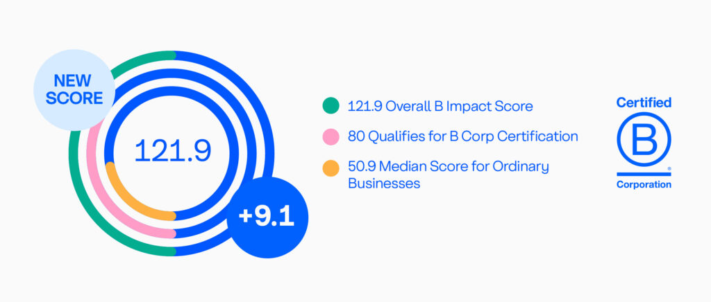 Since our 2021 recertification, we’ve taken deliberate steps to strengthen our B Corp performance while advancing our purpose-driven goals. By aligning our purpose objectives with the B Impact Assessment and conducting a comprehensive gap analysis, we identified opportunities to create meaningful progress across all impact areas—and we delivered.